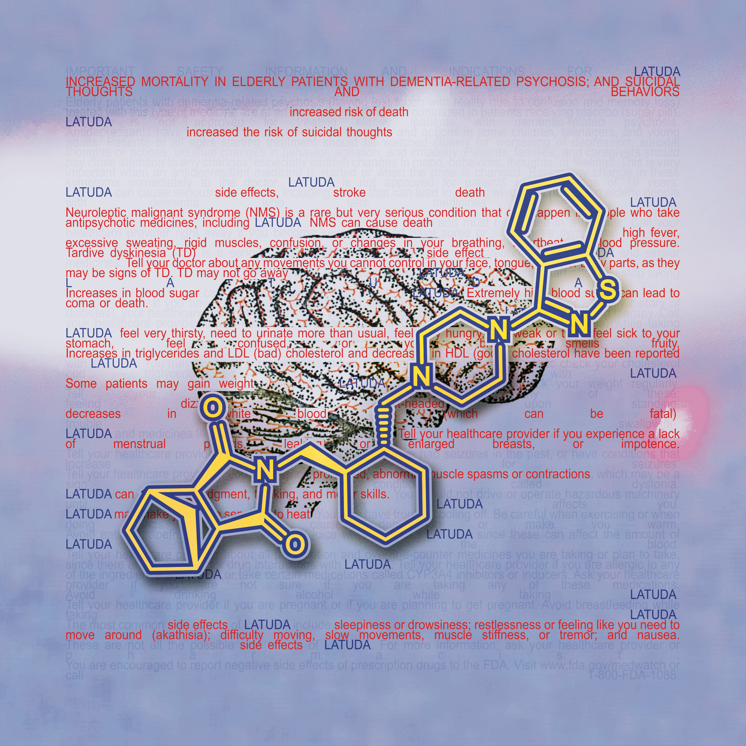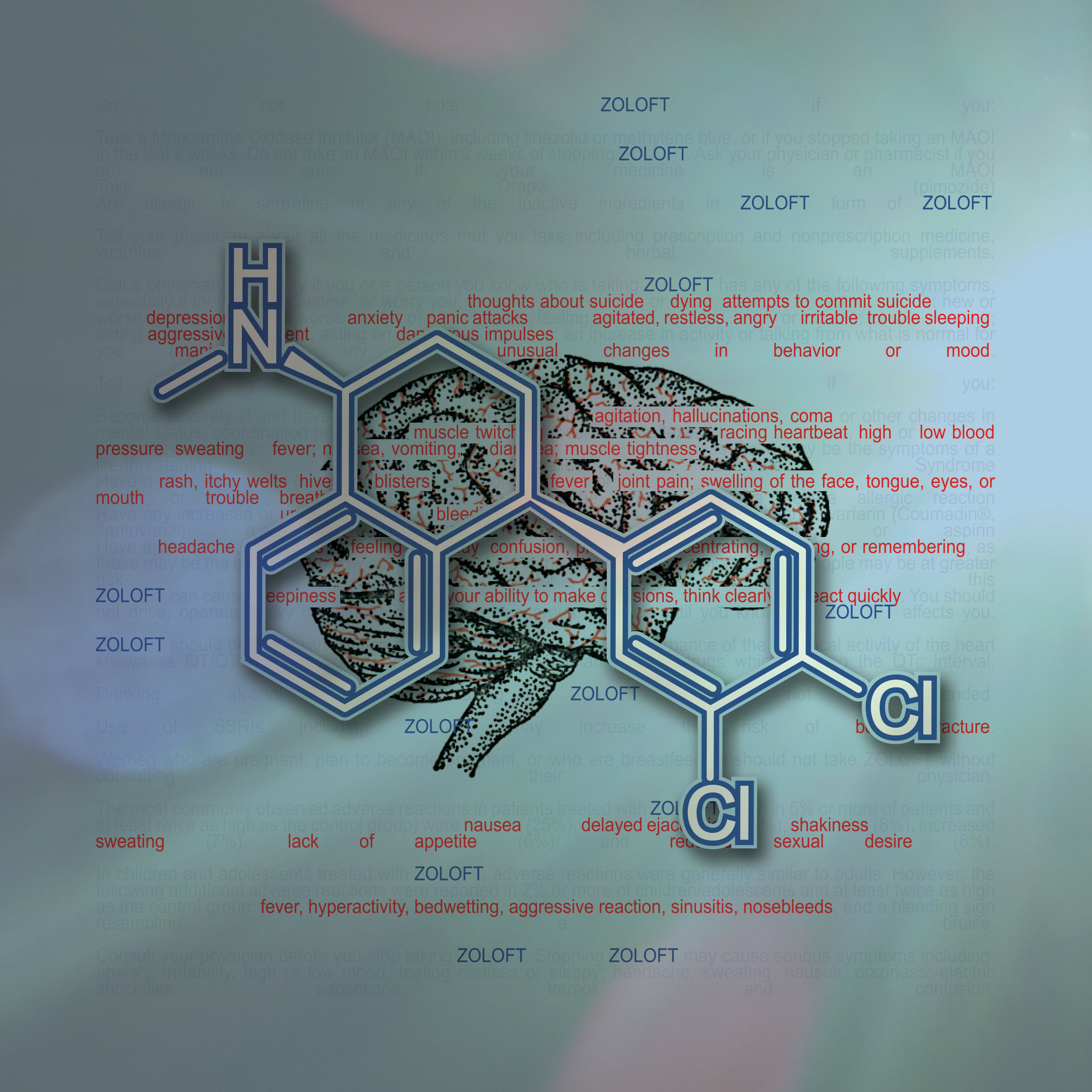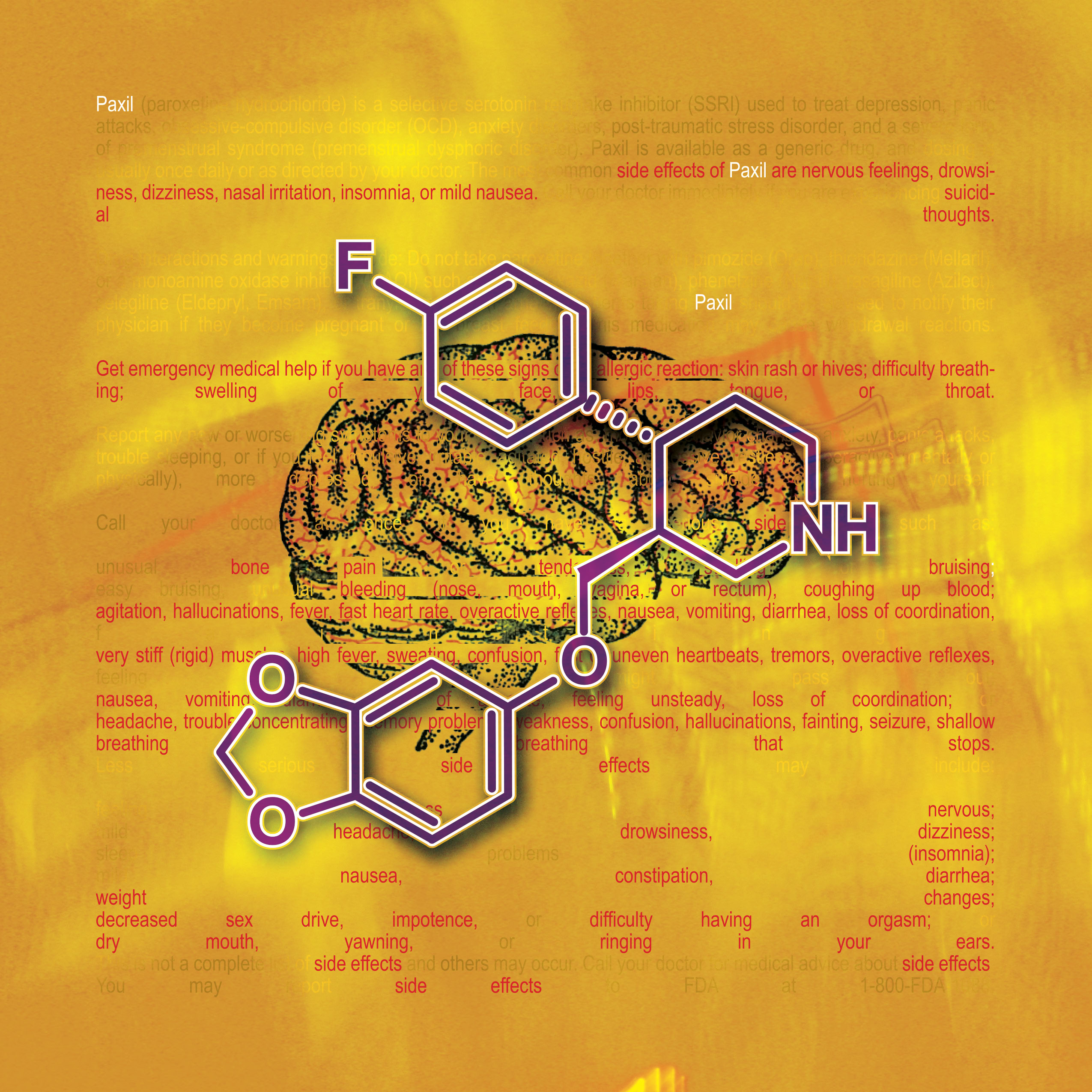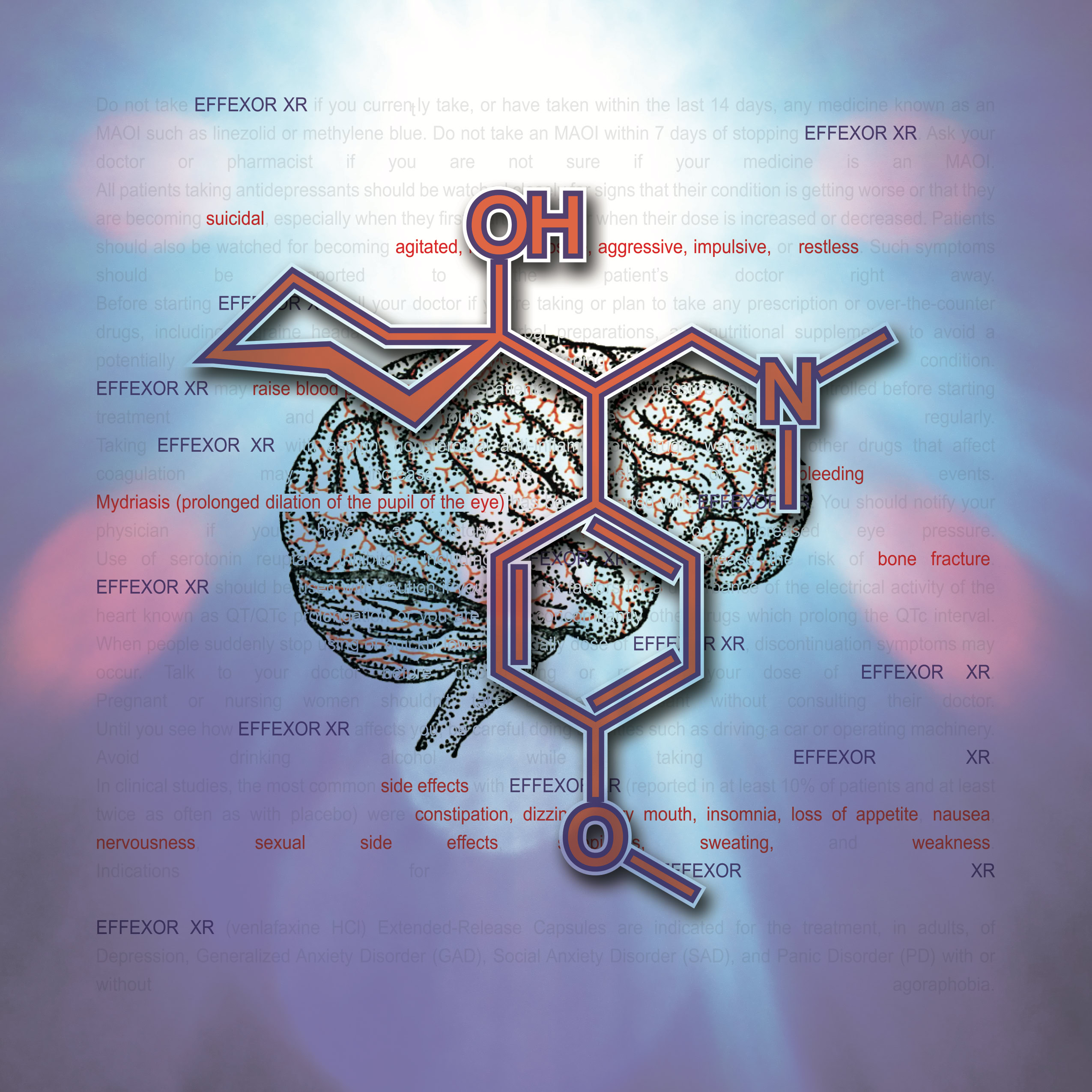 Information and colors obtained from each drugs website. Text highlighted In red are the drug side effects. The molecular composition of the drug and the anatomical illustration pertains to the area effected by the drug.