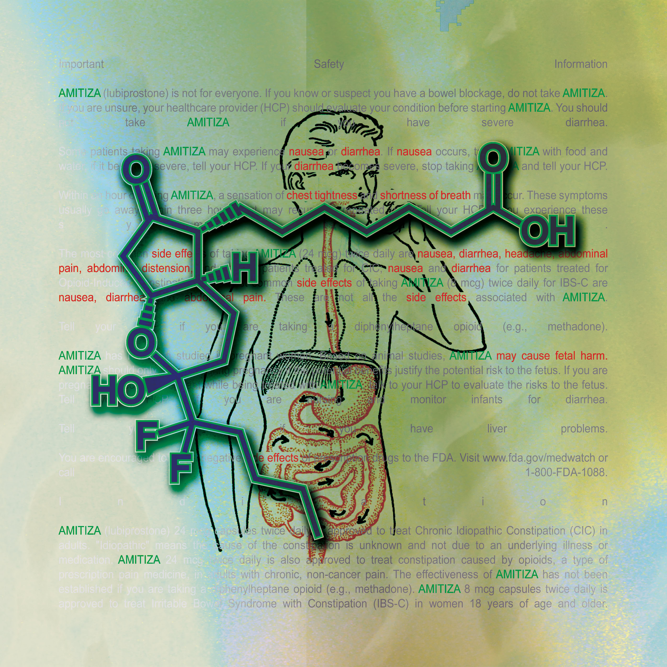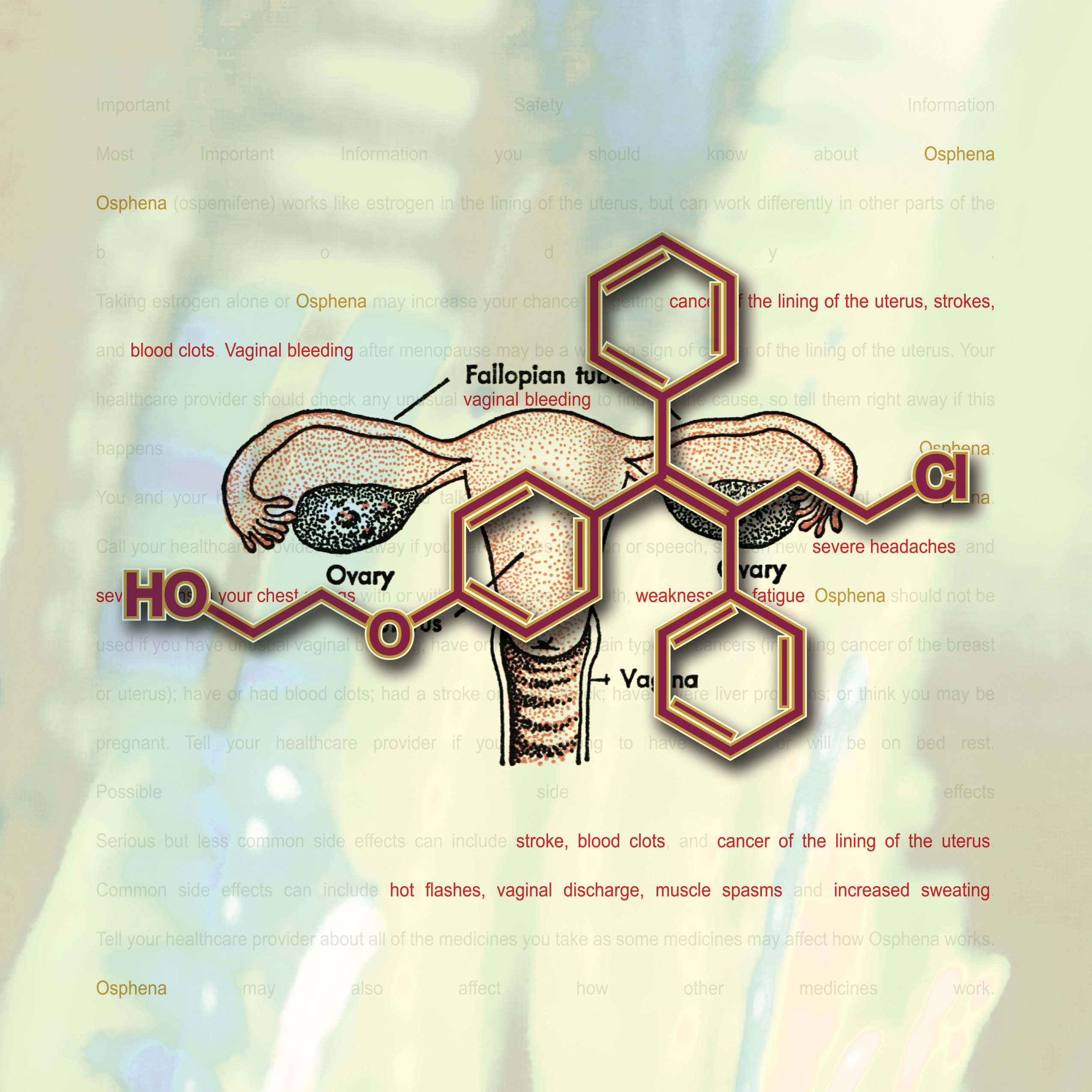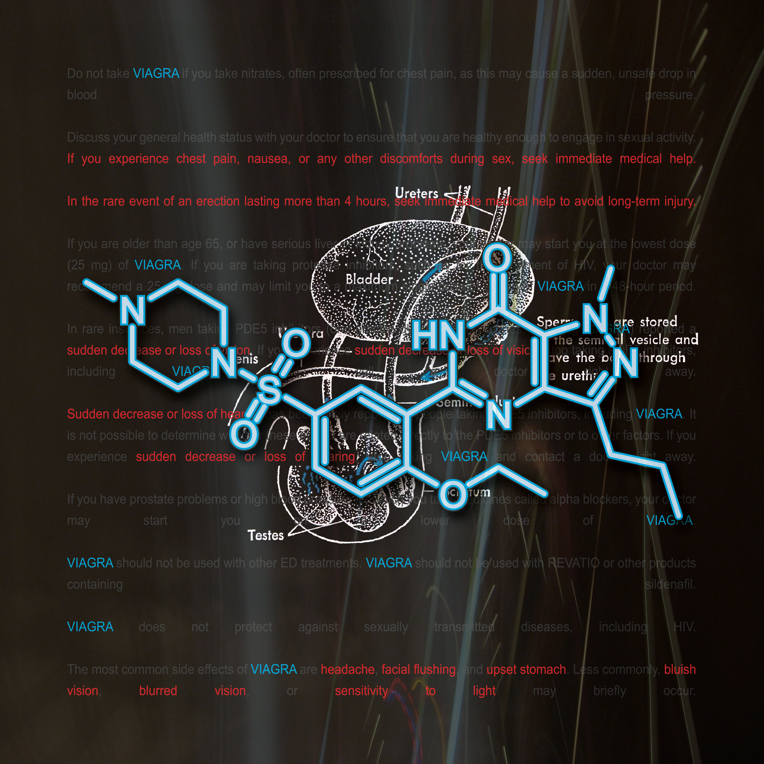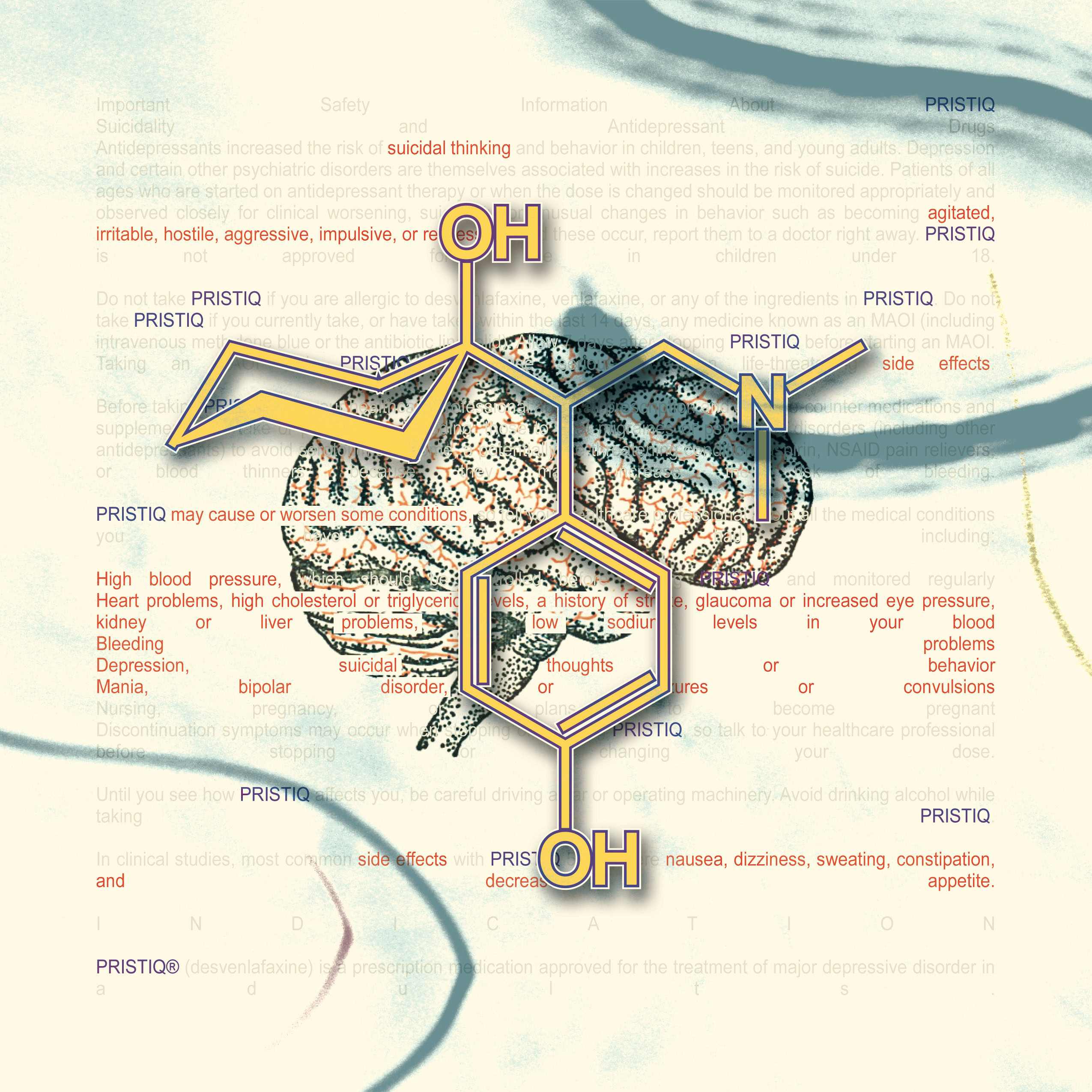 Information and colors obtained from each drugs website. Text highlighted In red are the drug side effects. The molecular composition of the drug and the anatomical illustration pertains to the area effected by the drug.