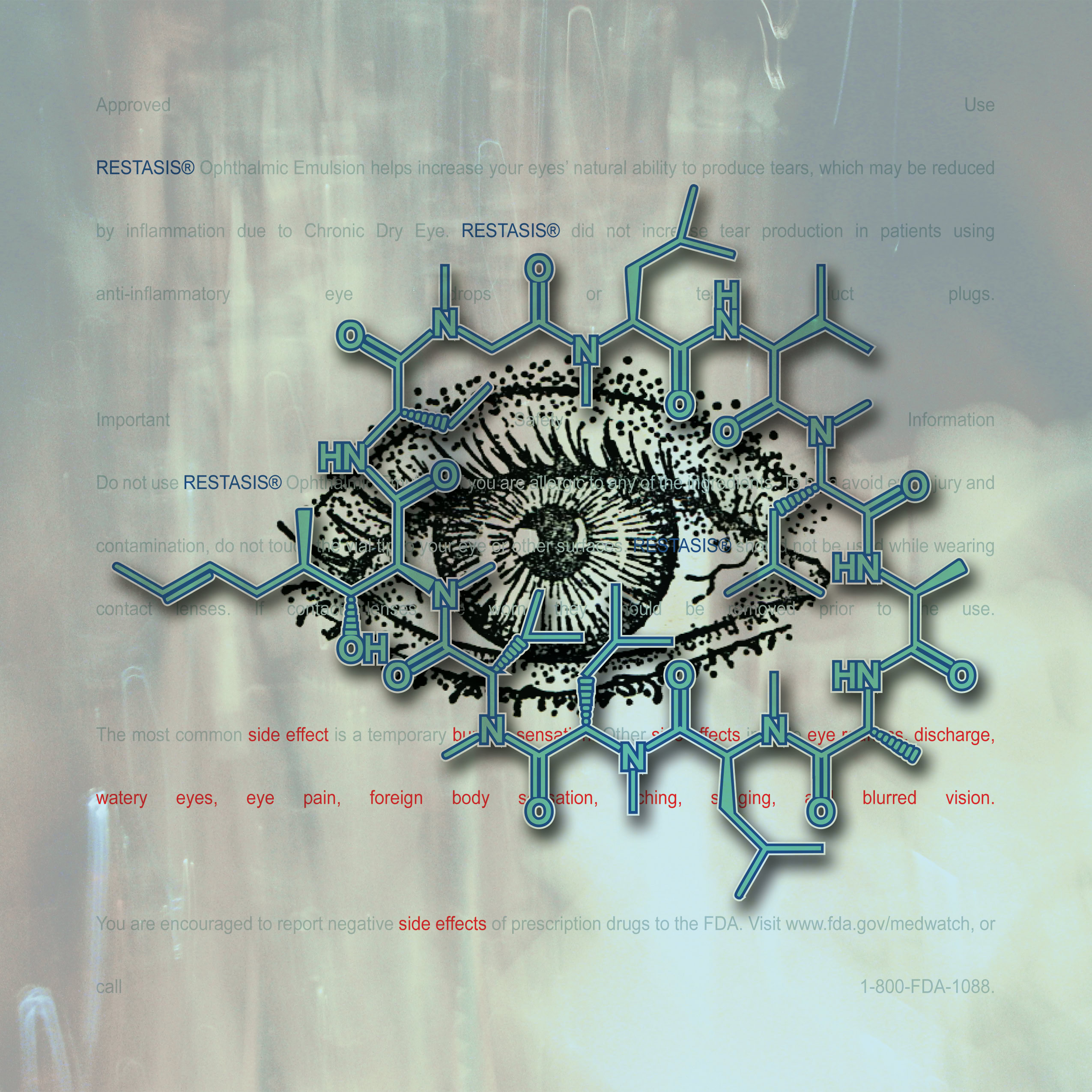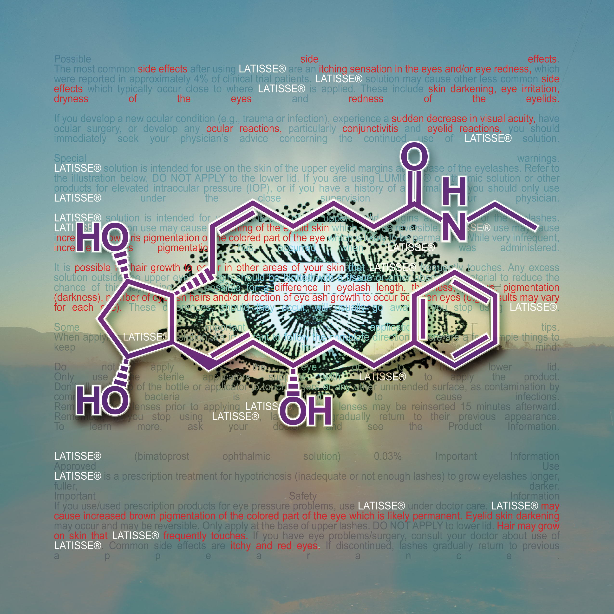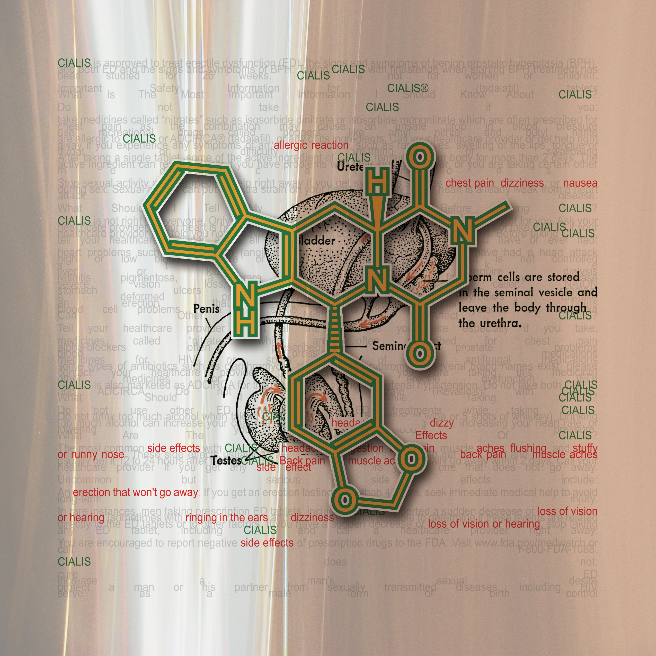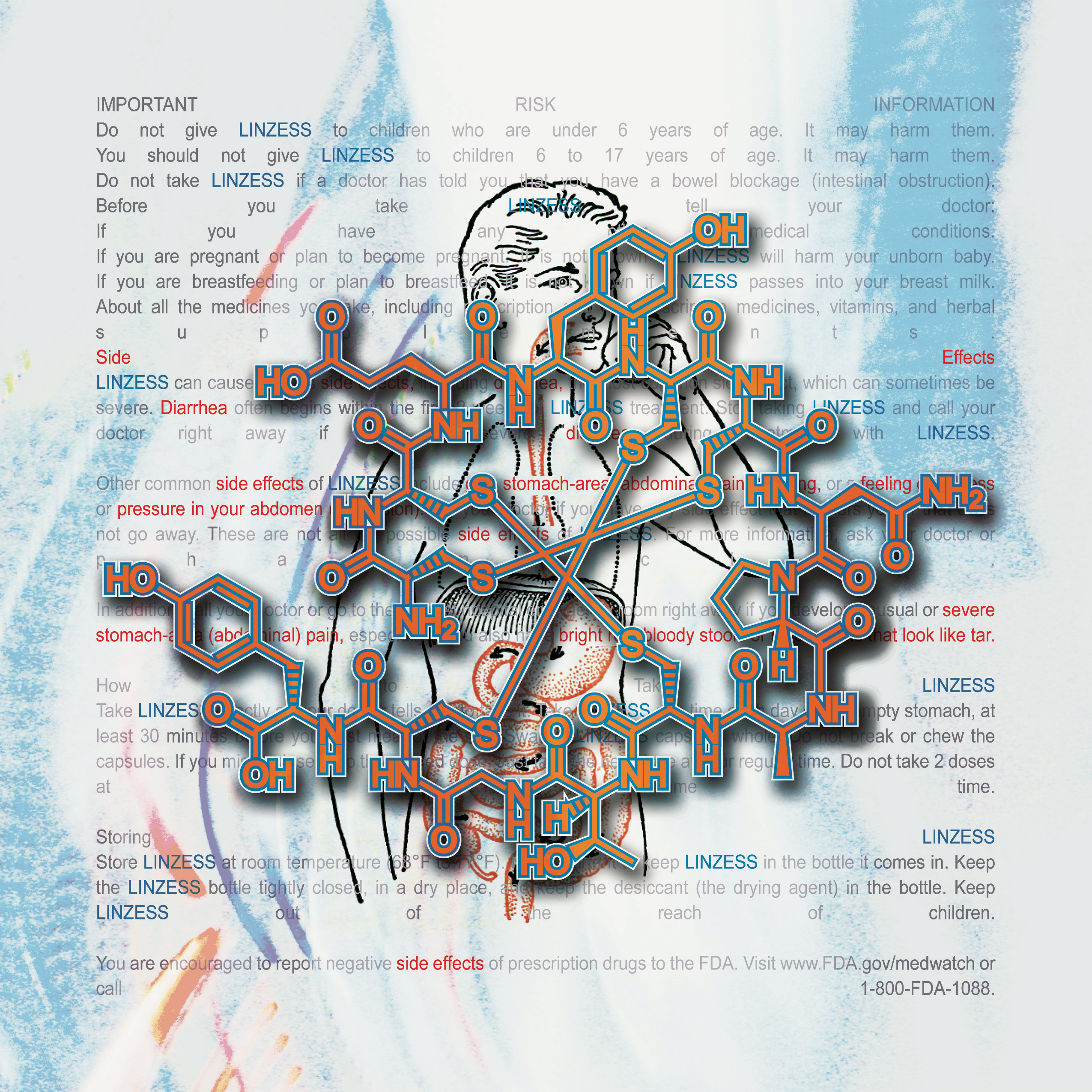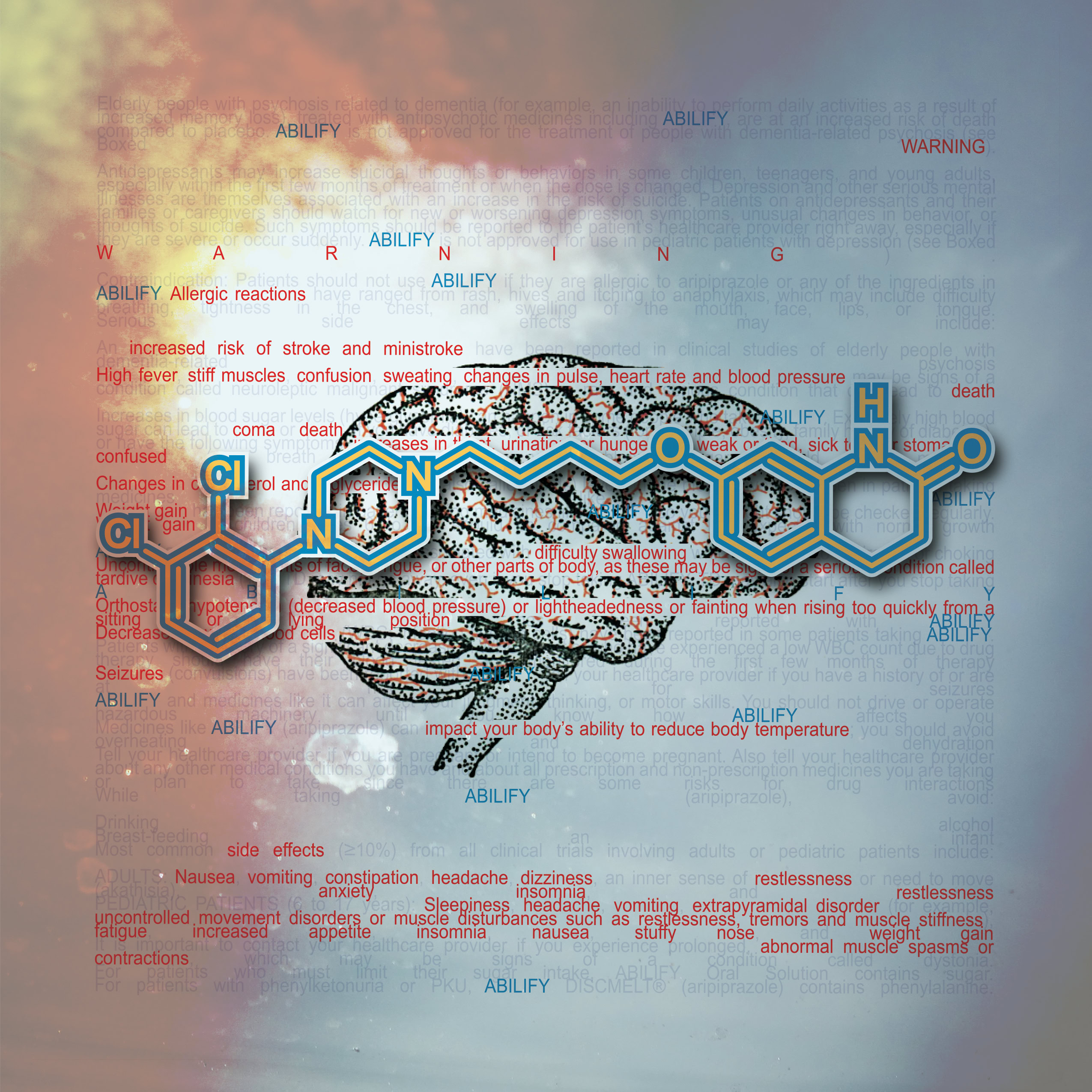 Information and colors obtained from each drugs website. Text highlighted In red are the drug side effects. The molecular composition of the drug and the anatomical illustration pertains to the area effected by the drug.