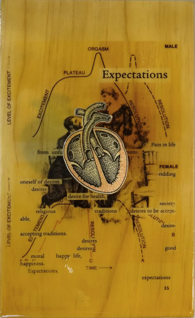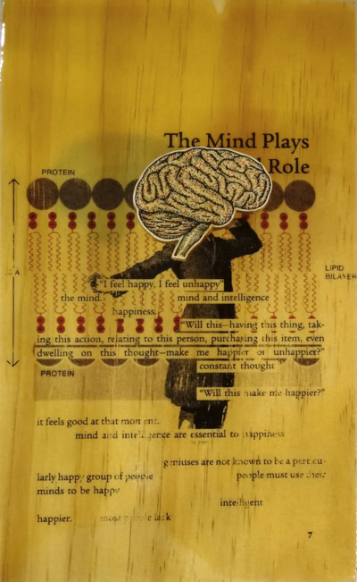 Three sources were combined for this series of ten pieces. Juxtaposing harsh realty with self-help hope.